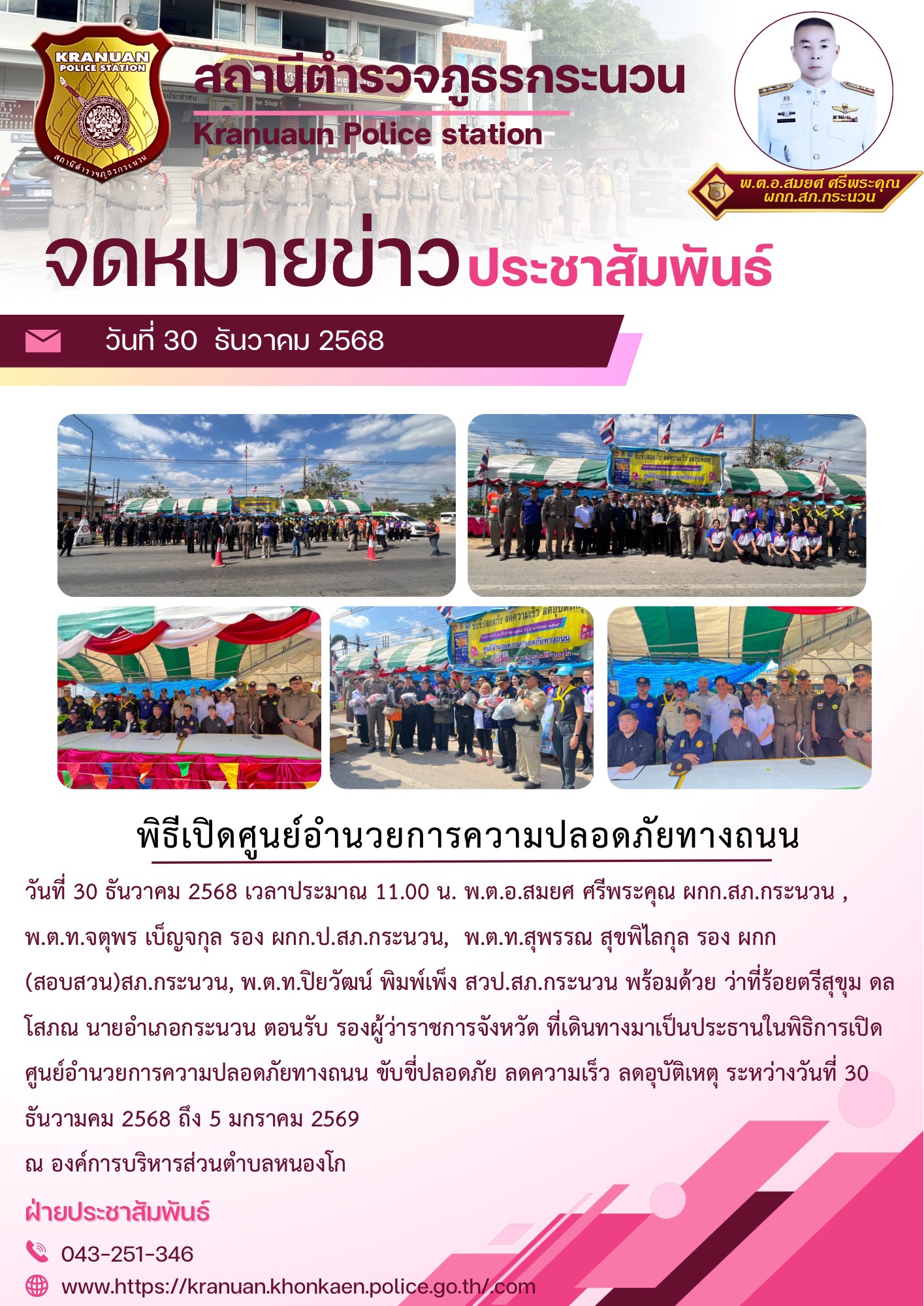 พ.ต.อ.สมยศ ศรีพระคุณ ผกก.สภ.กระนวน ออกตรวจเยี่ยมจุดบริการประชาชนในช่วงเทศกาลปีใหม่ 30 ม.ค.68 ถึง 5 ม