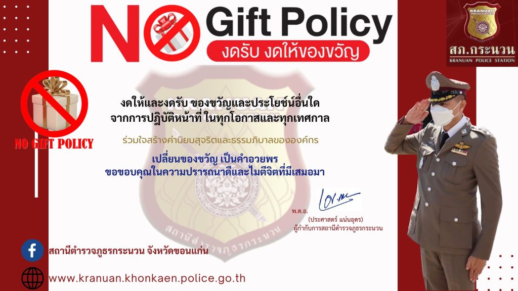 ข่าวกิจกรรมของผู้บังคับบัญชา”ผู้กับการสถานนีตำรวจภูธรกระนวนประกาศนโยบายต่อต้านการรับสินบน (Anti-Bribery policy)”
