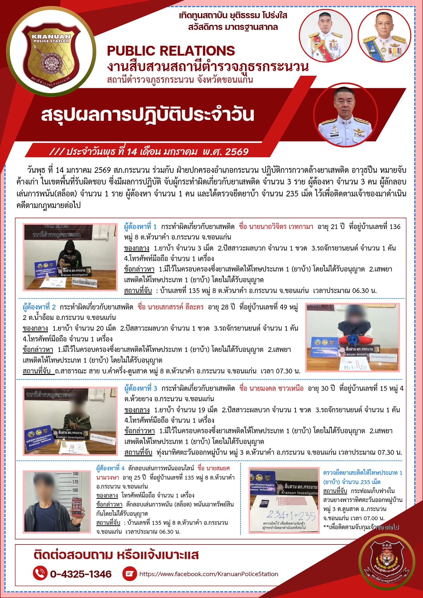 วันพุธ ที่ 14 มกราคม 2569 สภ.กระนวน ร่วมกับ ฝ่ายปกครองอำเภอกระนวน ปฏิบัติการกวาดล้างยาเสพติด อาวุธปืน หมายจับ