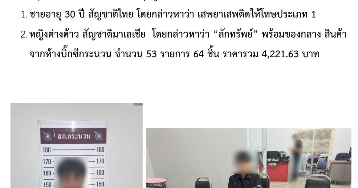 - หญิงต่างด้าว สัญชาติมาเลเชีย โดยกล่าวหาว่า “ลักทรัพย์” พร้อมของกลาง สินค้าจากห้างบิ๊กซีกระนวน จำนวน 53 รายการ 64 ชิ้น ราคารวม 4,221.63 บาท
