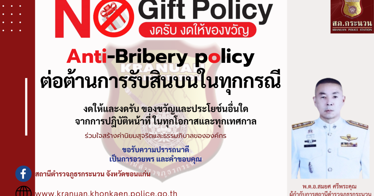 วันที่ 10 มีนาคม 2568 เวลา 14.00 น. พ.ต.อ.สมยศ ศรีพระคุณ ผกก.สภ.กระนวน , พ.ต.ท.กันตินันท์ สงครามยศ รอง ผกก.ป.สภ.กระนวน , พ.ต.ท.สุกฤษฎิ์ พุทธิทัยธีรธร รอง ผกก.สส.สภ.กระนวน , พ.ต.ท.สุพรรณ สุขพิไลกุล รอง ผกก.(สอบสวน)สภ.กระนวน พร้อมคณะทำงานและเจ้าหน้าที่ตำรวจทุกแผนกงาน ร่วมประกาศเจตนารมณ์ของหน่วยงานที่จะไม่รับของขวัญและของกำนัลทุกชนิดจากการปฏิบัติหน้าที่ (No Gift Policy) ประจำปีงบประมาณ พ.ศ.2568 ณ ห้องประชุม สภ.กระนวน