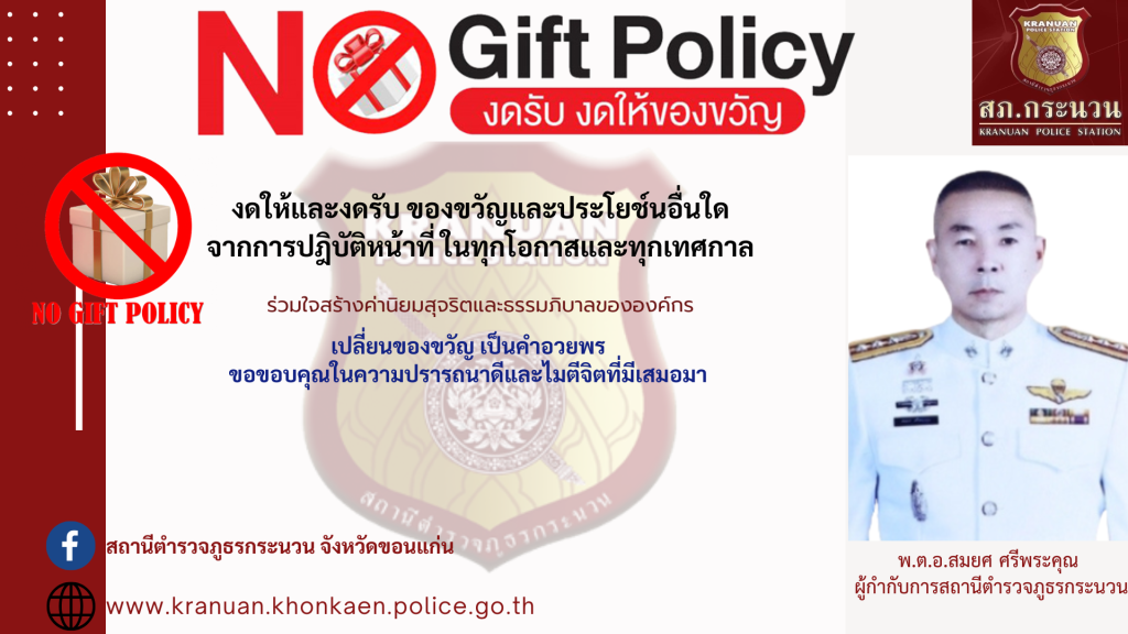 ประกาศสถานีตำรวจภูธรกระนวน เรื่อง นโยบายต่อต้านการรับสินบน (Anti-Bribery Policy) และการไม่รับของขวัญของกำนัลหรือประโยชน์อื่นใด (No Gift Policy) จากการปฏิบัติหน้าที่ ประจำปีงบประมาณ พ.ศ. ๒๕๖๘